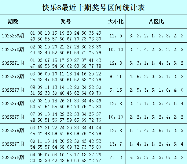 福彩快乐8第2025278期奖号为:04 05 07 08 10 15 17 18 22 26 30 33 39 42 48 50 63 68 72 77,其中奖号大小比为7:13,八区比为5:3:3:2:3:0:2:2。
